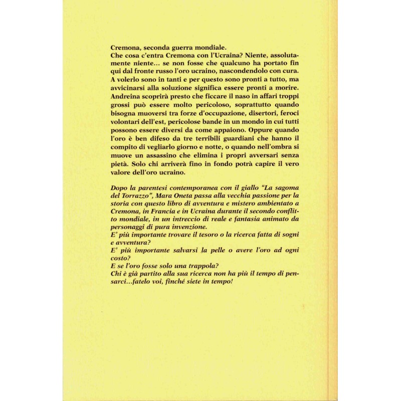 Che cosa c'entra Cremona con l'Ucraina? Niente, assolutamente niente... se non fosse che qualcuno ha portato fin qui dal fronte russo l'ro ucraino, nascondendolo con cura. A volerlo sono in tanti e per questo sono pronti a tutto, ma avvicinarsi alla soluzione significa essere pronti a morire. Andreina scoprirà presto che ficcare il naso in affari troppi può essere pericoloso, soprattuto quando bisogna muoversi tra forze d'ocupazzione, disertori, feroci volontari dell'est, pericolose bande in un mondo in cui tutti possono essere diverse da come appaiono. Oppure quando l'oro è ben difeso da tre terribili guardiani che hanno il compito di vegliarlo giorno e notte, o quando nell'ombra si muove un assassino che elimina i propri avversari senza pietà.