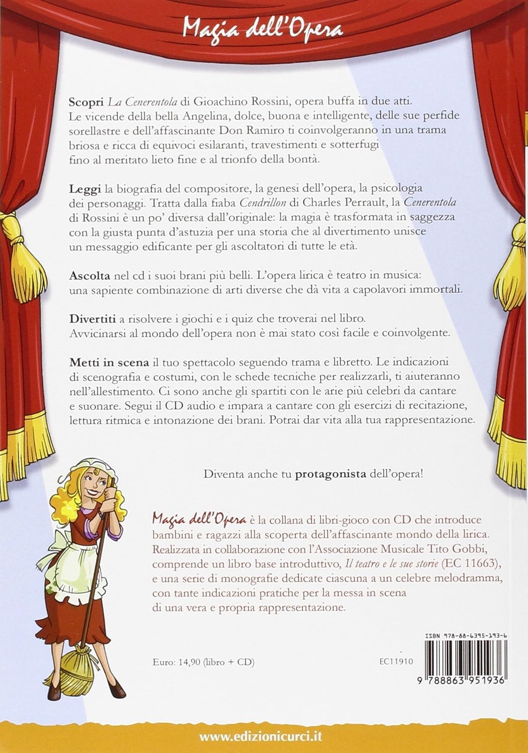 Scopri La Cenerentola di Gioachino Rossini, opera buffa in due atti. Le vicende della bella Angelina, dolce, buona e intelligente, delle sue perfide sorellastre e dell'affascinante Don Ramiro ti coinvolgeranno in una trama briosa e ricca di equivoci esilaranti, travestimenti e sotterfugi fino al meritato lieto fine e al trionfo della bontà. Leggi la biografia del compositore, la genesi dell'opera, la psicologia dei personaggi. Tratta dalla fiaba Cendrillon di Charles Perrault, la Cenerentola di Rossini è un po'diversa dall'originale: la magia è trasformata in saggezza con la giusta punta d'astuzia per una storia che al divertimento unisce un messaggio edificante per gli ascoltatori di tutte le età. Ascolta nel cd i suoi brani più belli. L'opera lirica è teatro in musica: una sapiente combinazione di arti diverse che dà vita a capolavori immortali. Divertiti a risolvere i giochi e i quiz che troverai nel libro. Avvicinarsi al mondo dell'opera non è mai stato così facile e coinvolgente. Metti in scena il tuo spettacolo seguendo trama e libretto. Le indicazioni di scenografia e costumi, con le schede tecniche per realizzarli, ti aiuteranno nell'allestimento. Ci sono anche gli spartiti con le arie più celebri da cantare e suonare. Segui il CD audio e impara a cantare con gli esercizi di recitazione, lettura ritmica e intonazione dei brani. Potrai dar vita alla tua rappresentazione.