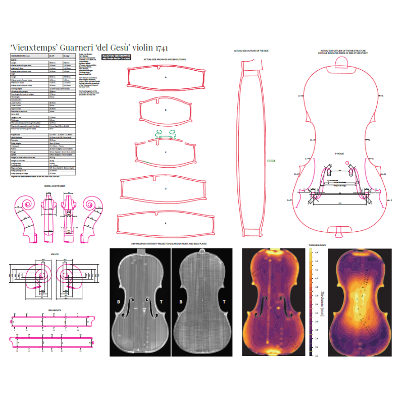 Oltre alle misurazioni complete, il retro di questo poster contiene scansioni TC dettagliate, mappe dello spessore e sezioni trasversali delle arcate a dimensioni reali. Il violino si trova ancora in un notevole stato di conservazione, soprattutto considerando che è stato in uso per gran parte della sua vita.
